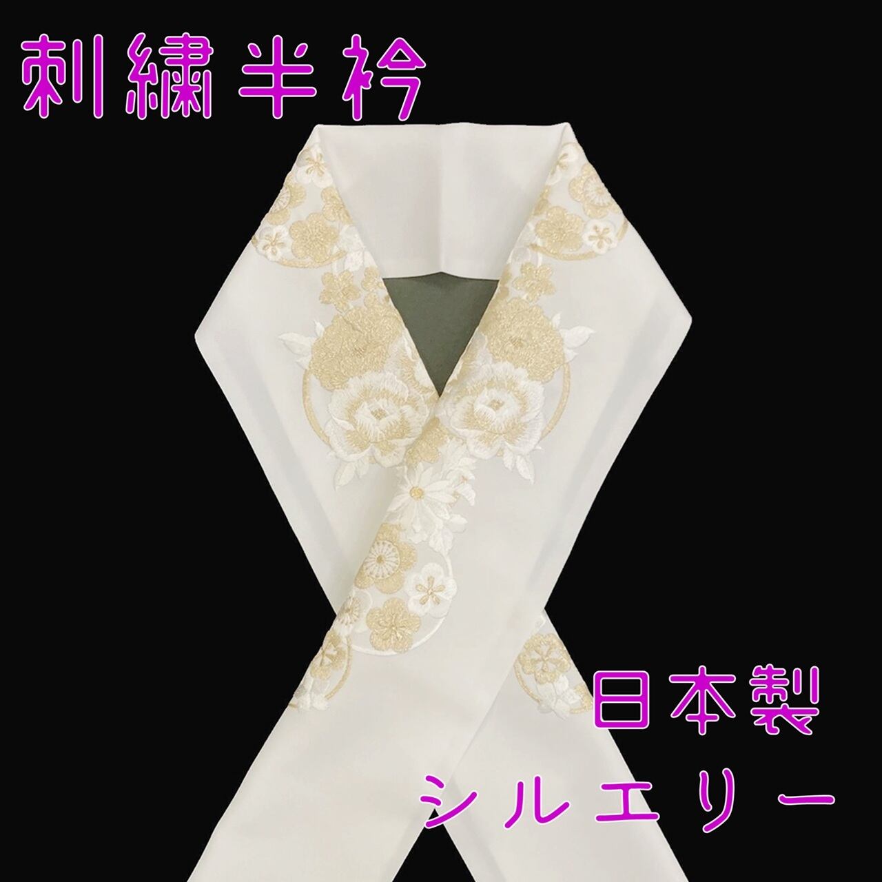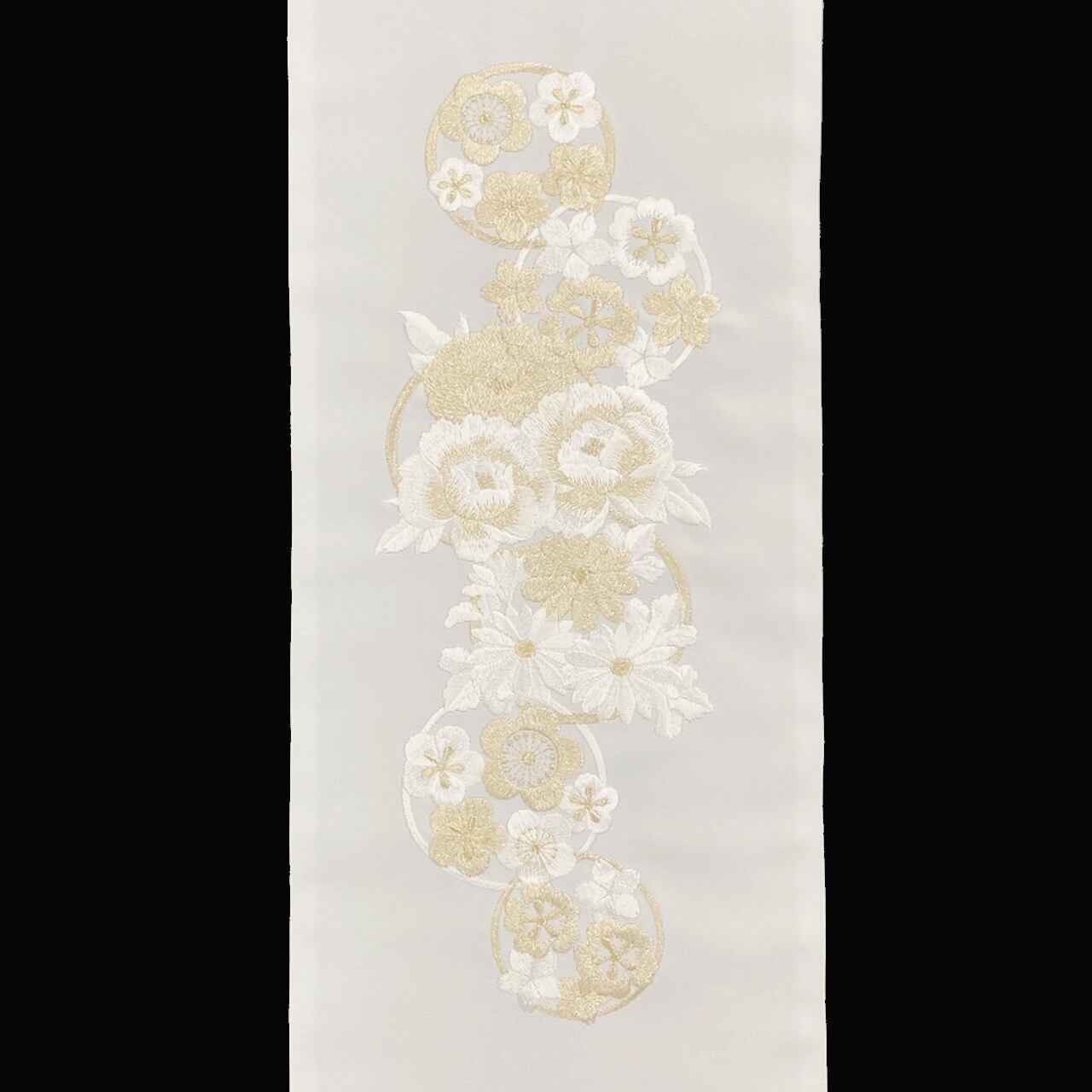 半衿 刺繍 花の丸 金 白地 シルエリー 新合繊 日本製 刺繍衿 和装小物 着物 成人式 卒業式 結婚式