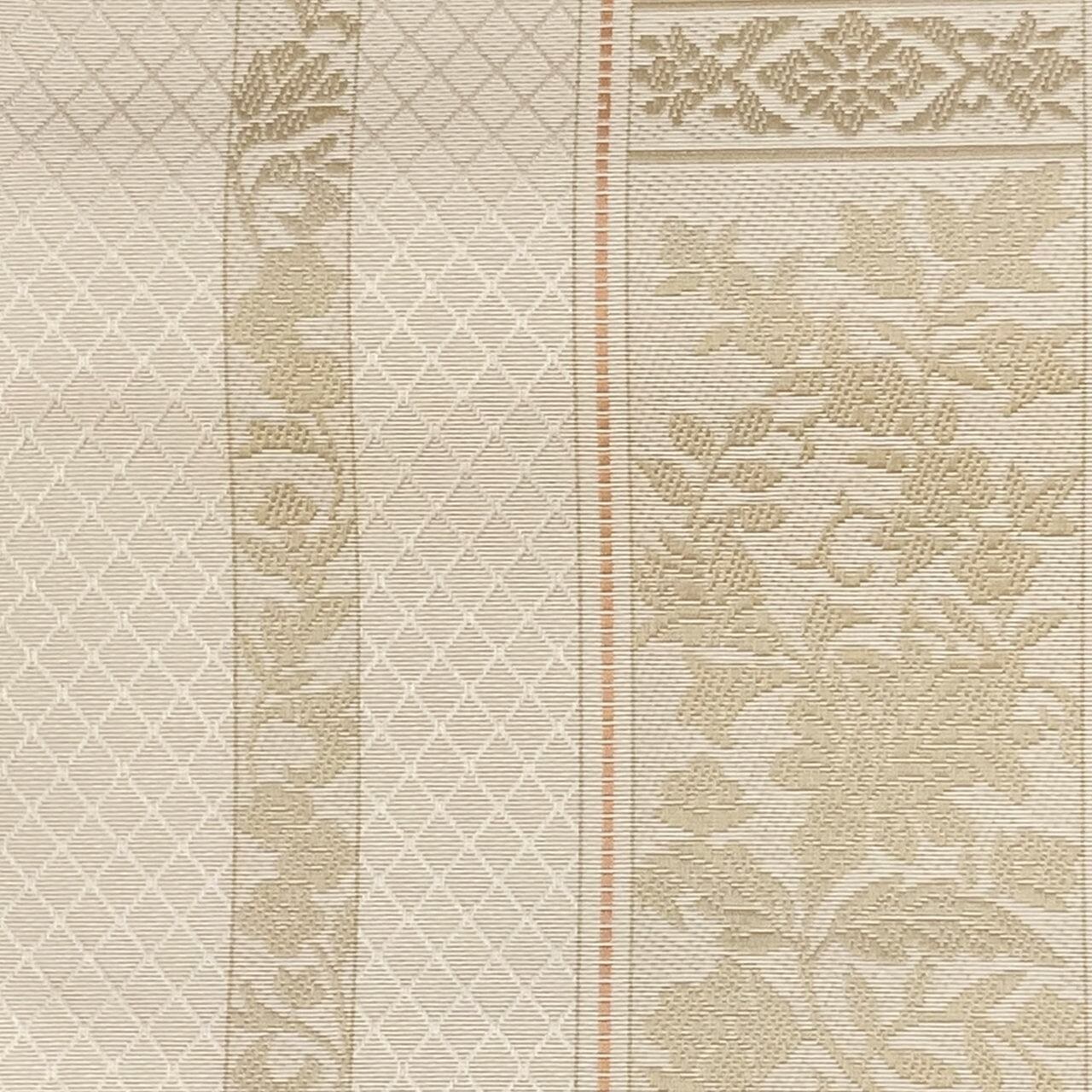 経糸の密度が高く入念に織り込まれていることから、独特の厚みとハリ感があり、帯を締めた時の「キュッ」という絹鳴りが特徴です。