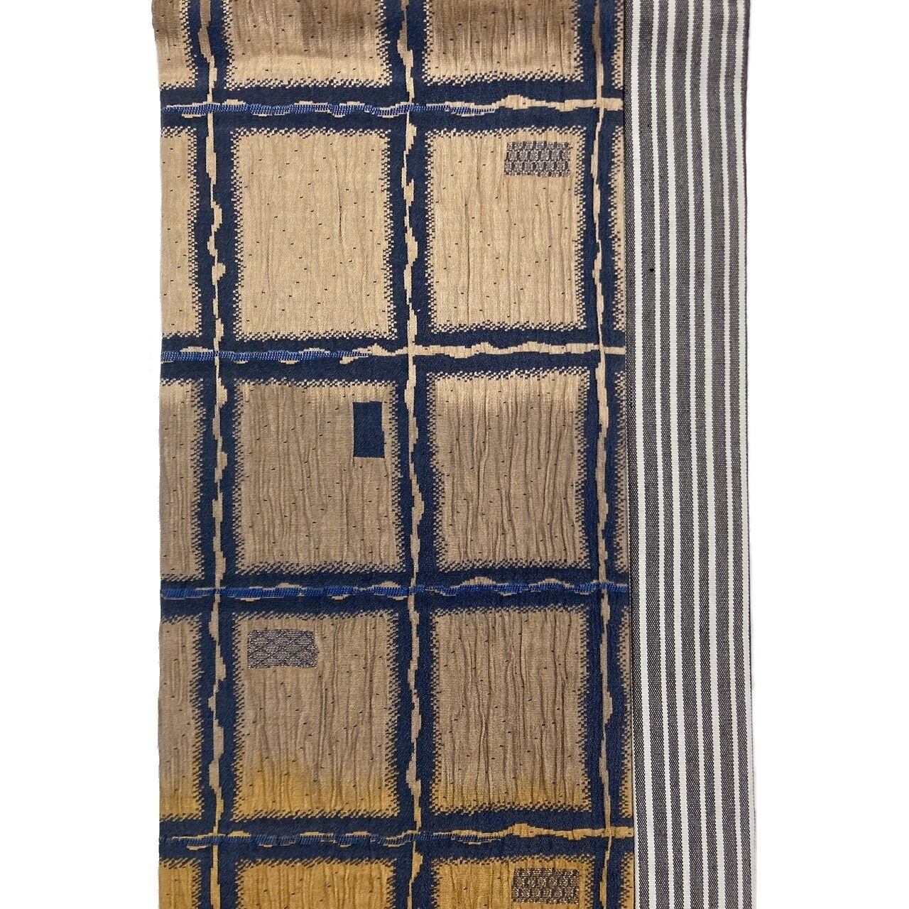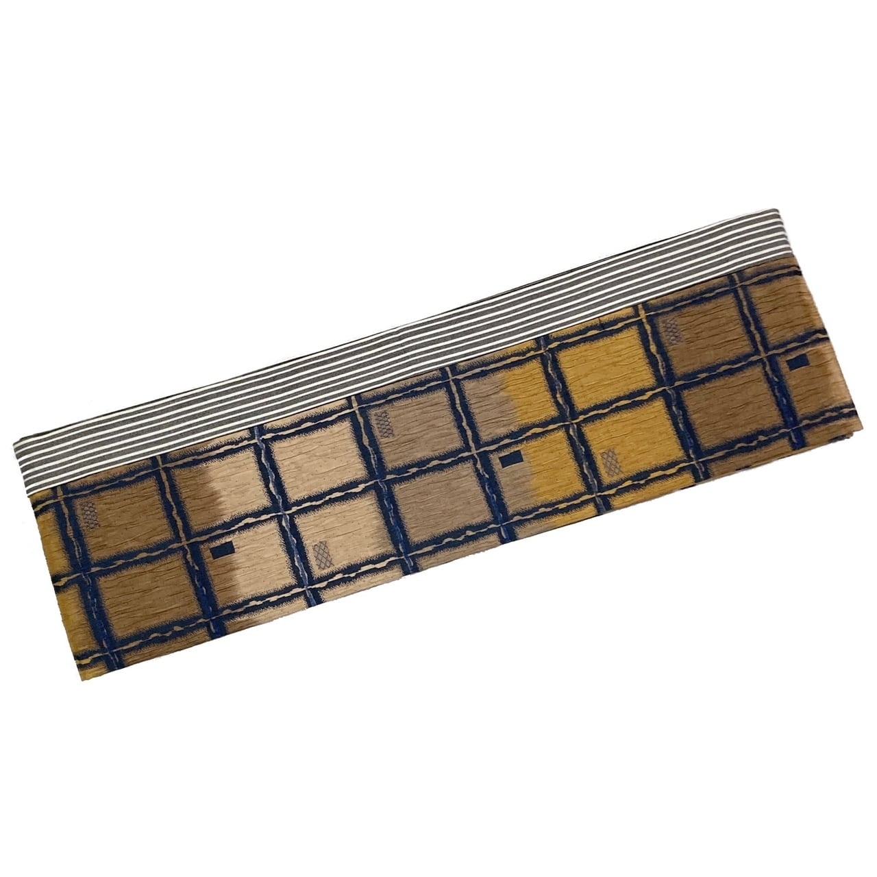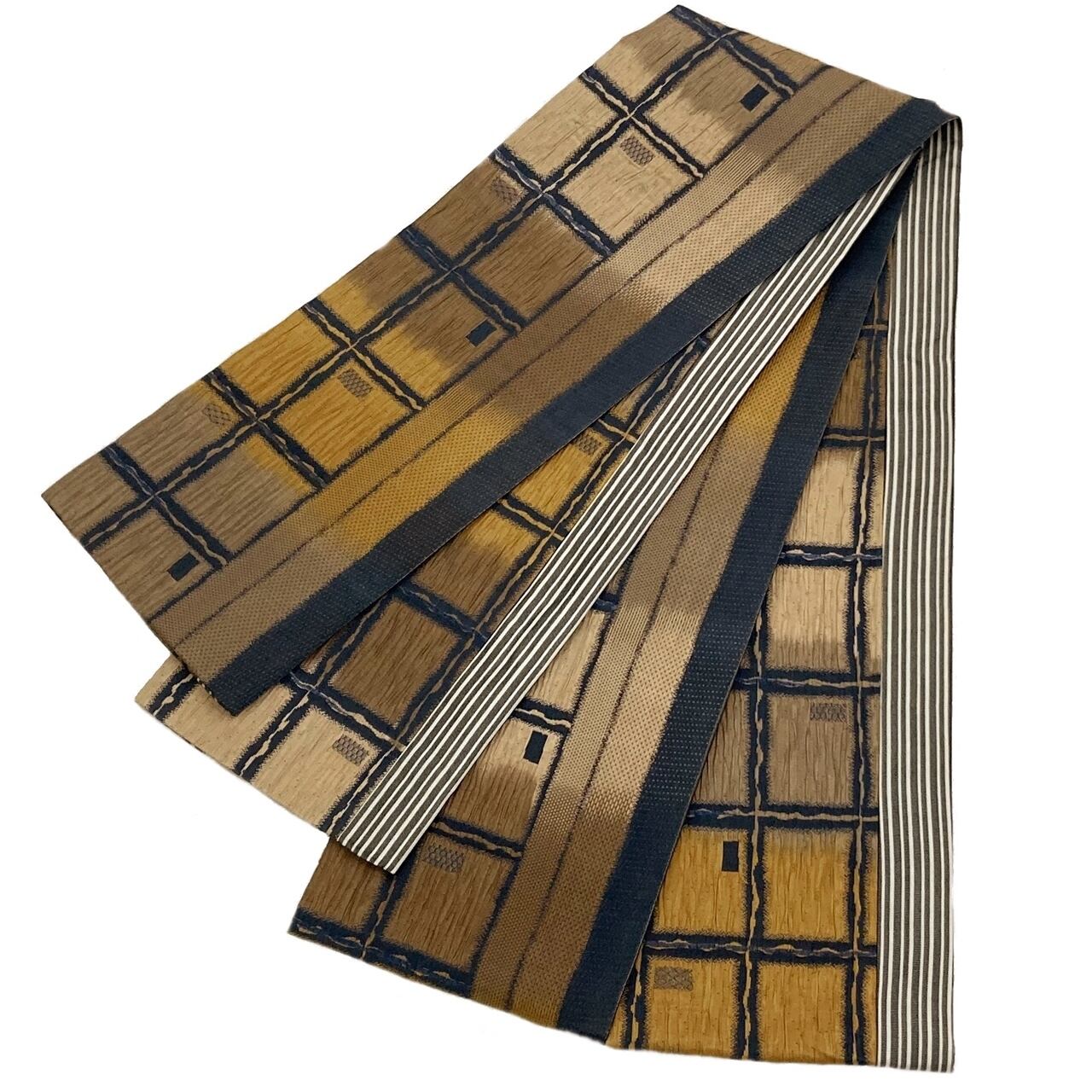 カラシやベージュのボカシと紺地の格子を組み合わせた、すっきりした柄行きです。